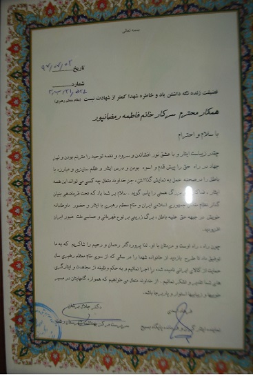 در این دیدار ضمن گرامی داشت هفته دفاع مقدس و یاد و خاطره معمار کبیر انقلاب و شهدای جنگ تحمیلی ، لوح تقدیر و هدایایی به رسم یادبود از طرف ریاست مرکز بهداشت به خانواده شهید رمضانپور اهداگردید.