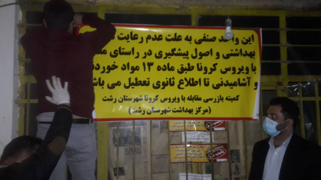 در راستای کنترل محیطی ویروس کرونا در مورخ ۹۹/۱/۹ راس ساعت ۲۳/۳۰ دقیقه شب، یک واحد صنفی چایخانه واقع در پیربازار به دلیل دارا بودن نواقص بحرانی غیر قابل رفع در محل و عدم رعایت فاصله گذاری اجتماعی توسط واحد مهندسی بهداشت محیط مرکز بهداشت شهرستان رشت تا اطلاع ثانوی پلمب و غیرفعال گردید.