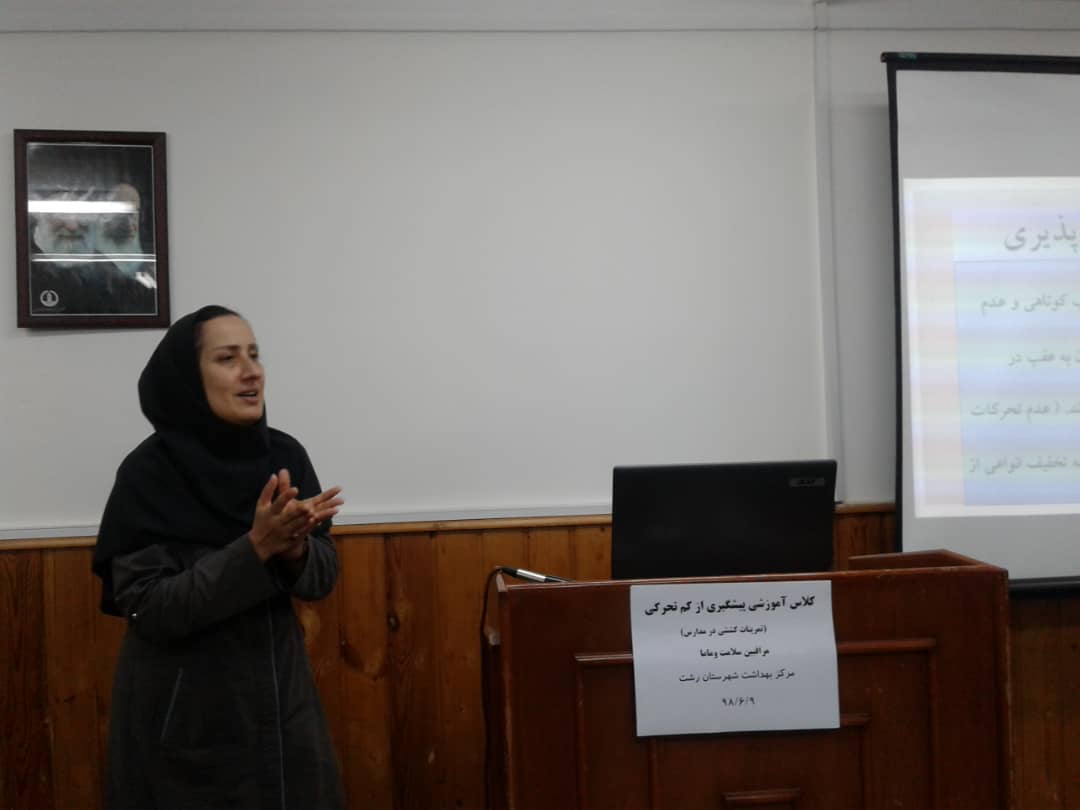 در مورخه شنبه 9 شهریور 98 و یکشنبه 10شهریور 98 کلاس باز آموزی مراقبین سلامت در سالن اجتماعات مرکز بهداشت رشت به عمل آمد . در این کلاس ها در روز نهم شهریور 71 نفر و در روز دهم شهریور 49 نفر جهت شرکت در کلاس حضور بهم رساندند. در این کلاس ها خانمها حقی , خادمی واسدالهی درباره پیشگیری از رفتار های مخاطره آمیز در جوانان و اصول فعالیتهای بدنی و تحرک بدنی در جوانان و فواید تحرک بدنی در نوجوانان و نحوه انجام صحیح حرکات کششی در نوجوانان و انجام و نظارت بر برنامه تمرینات کششی در مدارس مروج سلامت آموزش انجام شد .